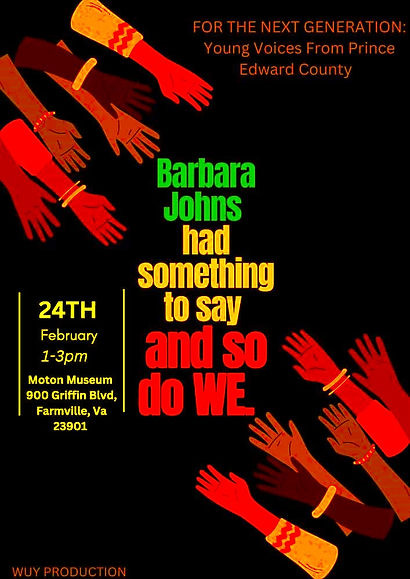 In 2024, the students of Prince Edward High used this powerful legacy and their own performing arts, storytelling, and musical gifts to make their voices heard. They did this through a community-wide Black History program performed from the very stage where Barbara Johns inspired change over 70 years prior. They titled the program, For the Next Generation, knowing that, like Johns, they would likely not reap the benefits of their efforts. You can learn more about this program here.
